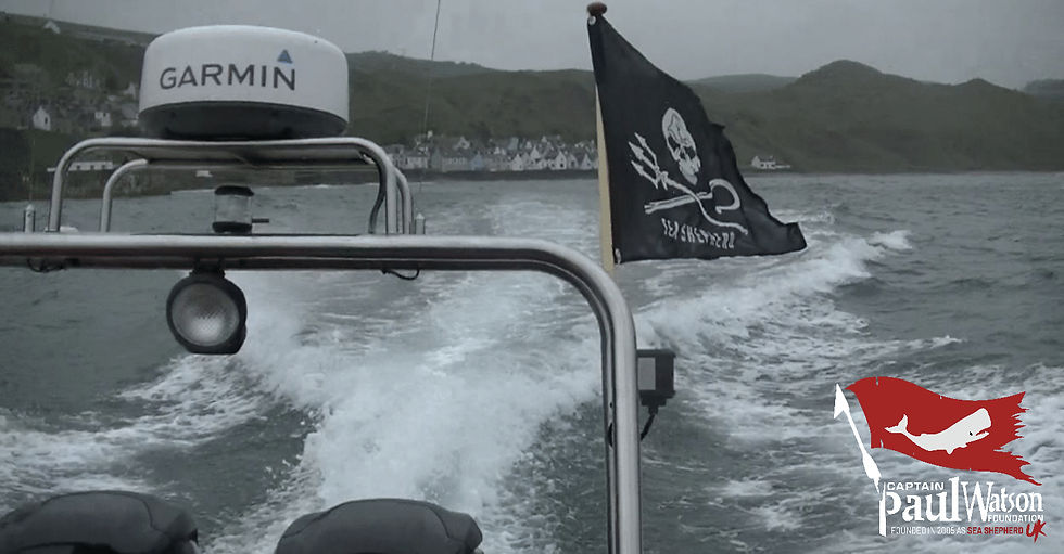 Spitfire leaving Gardenstown Harbour and flying the Sea shepherd flag as she joins our Scottish Seal Defence Campaign.
